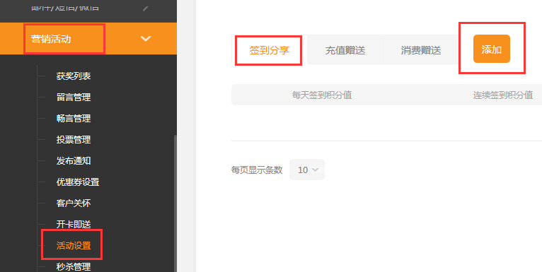 1、依次点击 营销活动-》活动设置-》签到分享-》添加